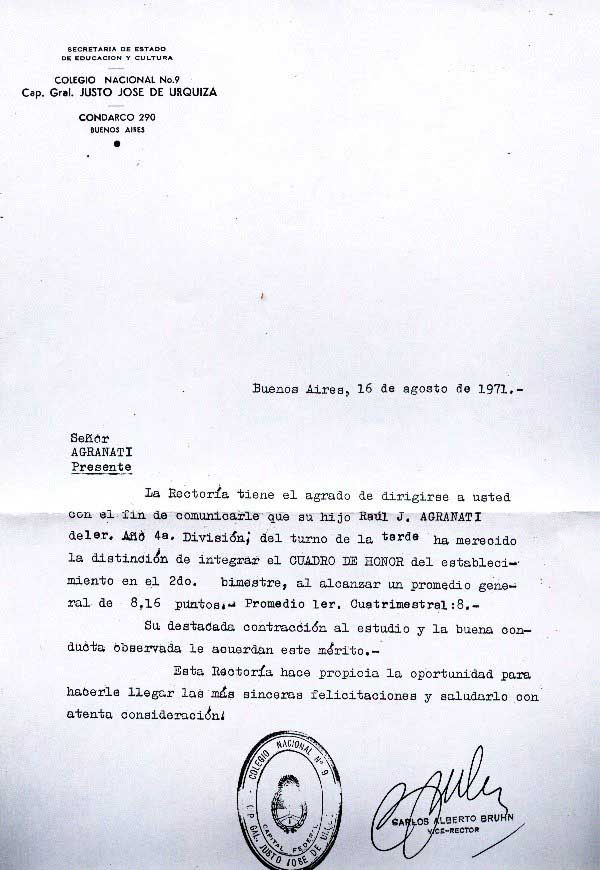 Información de integración al Cuadro de Honor de Raúl Agranatti en 1er año.