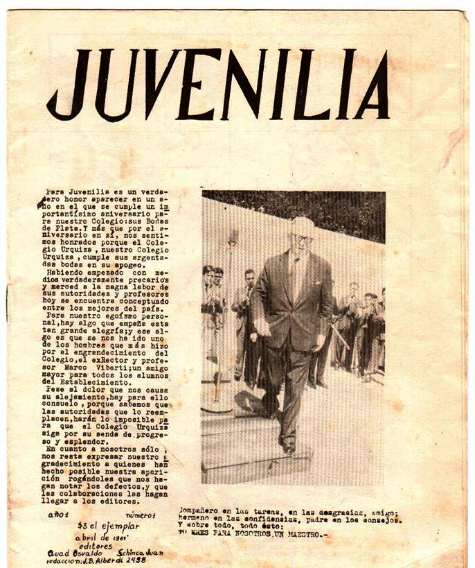 Para Juvenilla es un verdadero honor aparecer en un año en el que se cumple un omprtantísimo aniversario para nuestro colegio: sus Bodas de Plata. Y más que por el aniversario en sí, nos sentimos honrados porque el Colegio Urquiza, nuestro Colegio Urquizaq, cumple argentadas bodas en su apogeo. Habiendo empezado con medios verdaderamente precarios y merced a la magna labor de sus autoridades y profesores hoy se encuentra conceptuado entre los mejores del país. Para nuestro egoísmo personal, hay algo que empa?a esta grande alegría; y ese algo es que se nos ha ido uno de los hombres que más hizo por el engrandecimiento del Colegio, el exRector y profesor Marco Viberti; un amigo mayor para todos los alumnos del Establecimiento. Pese al dolor que nos causa su alejamiento, hay para ello consuelo, porque sabemos que las autoridades que lo reemplacen, harán lo imposible para que el Colegio Urquiza siga por su senda de progreso y esplendor. En cuanto a nosotros solo nos resta expresar nuesto agradecimiento a quienes han hecho posible nuestra aparición rogándoles que nos hagan nostar los defectos, y que las colaboraciones las hagan llegar a los editores.